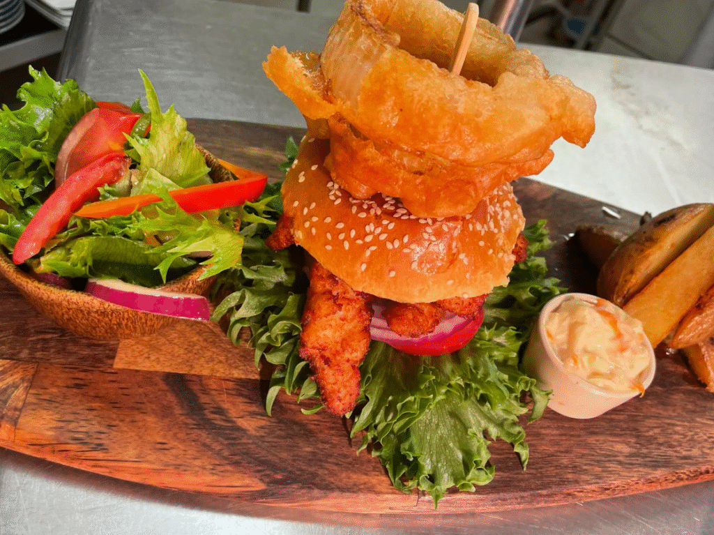 Breaded chicken breast,lettuce,tomato,bap,served with chips,salad,onion rings and homemade slaw.